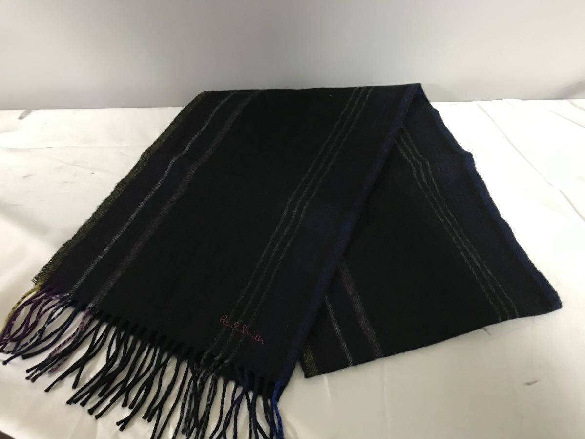 - 本物ポールスミスPAULSMITHカシミヤウールロゴ刺繍ストライプ柄マフラーストールショールメンズレディーススーツビジネス黒ブラック