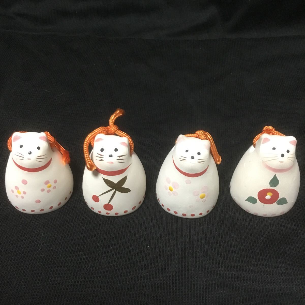 - 猫鈴4体 サクランボ梅椿置物 豆人形土人形ねこネコベル