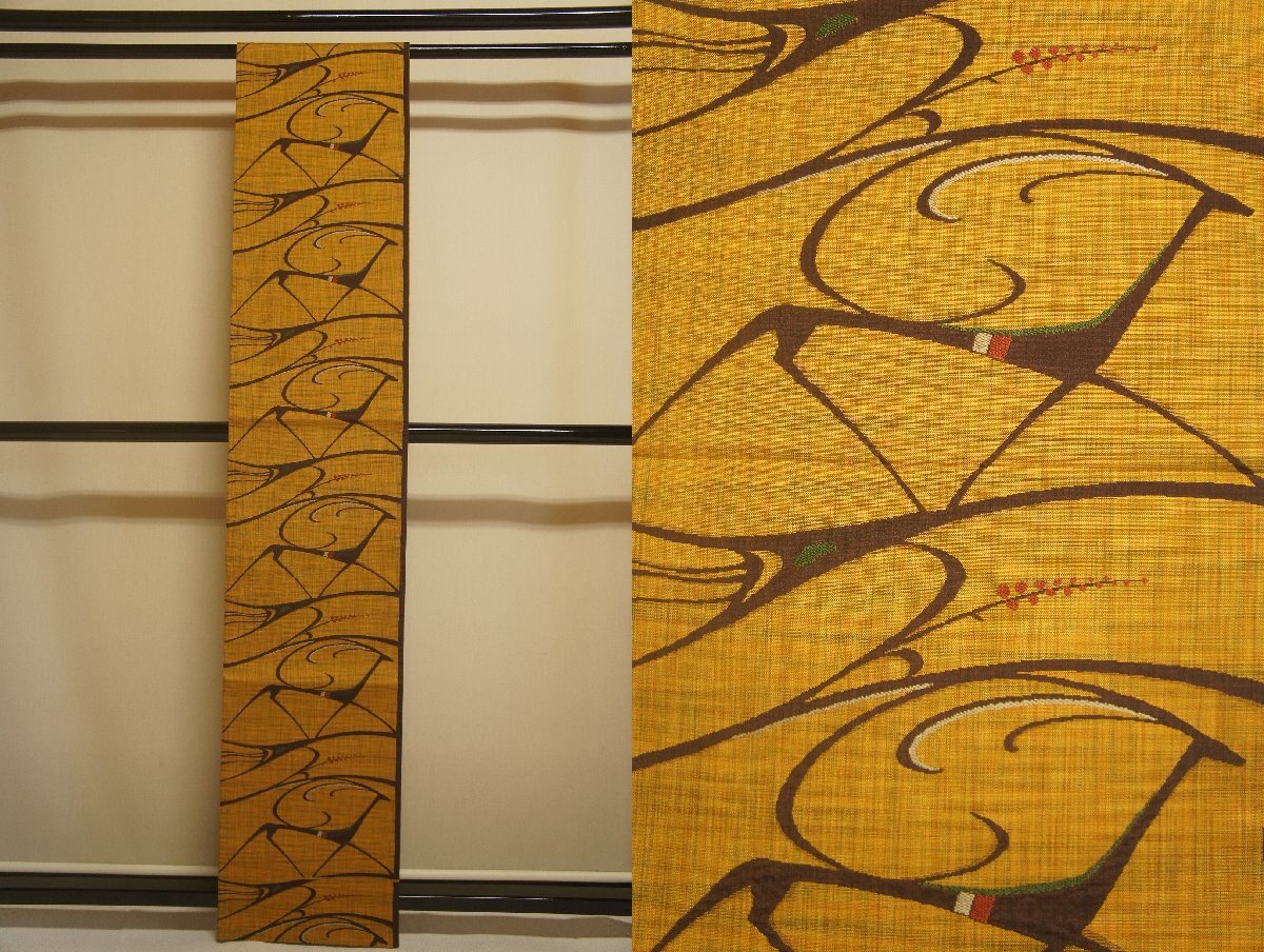 - 正絹黄土色糸地抽象鹿に草花模様未着用袋帯[O15084]