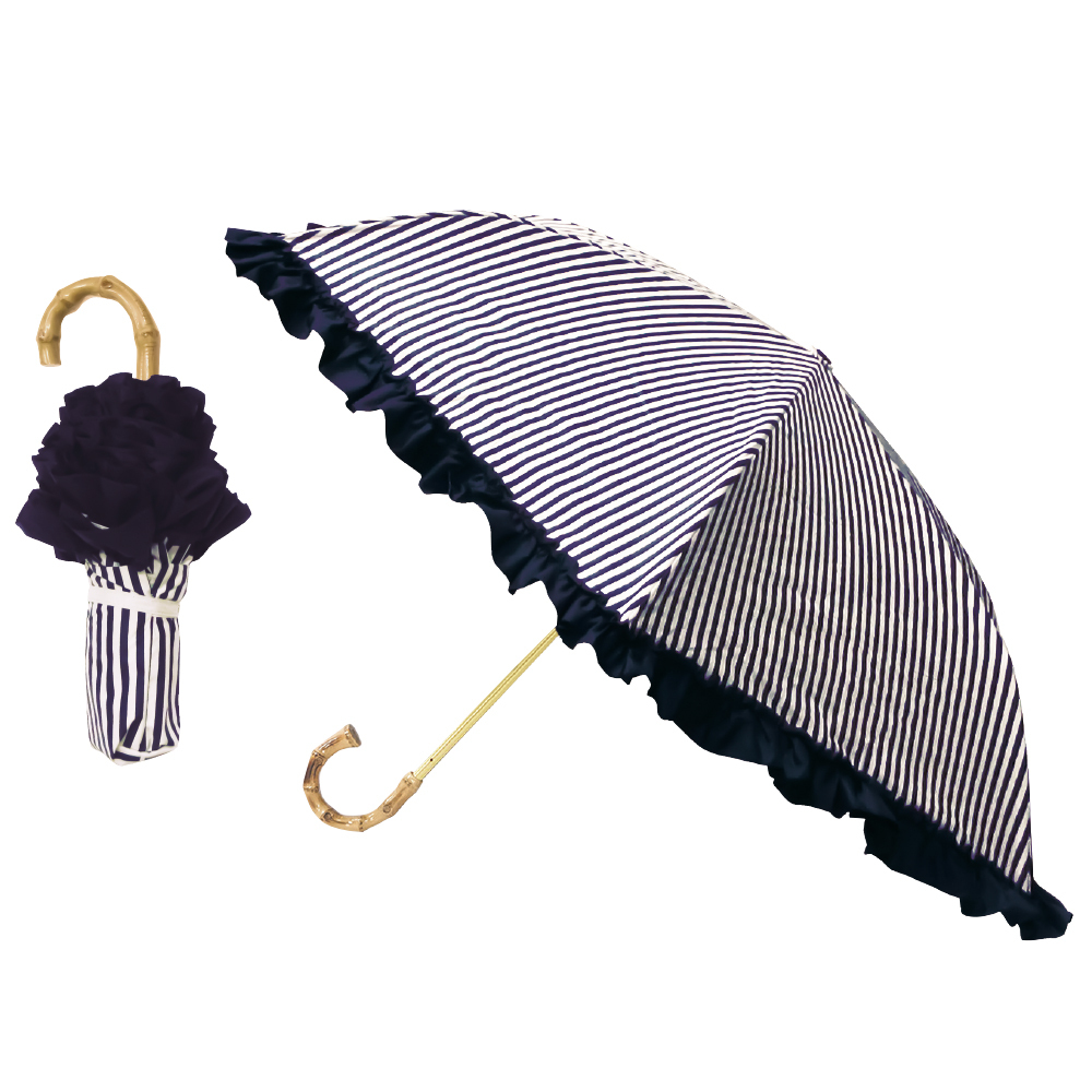 - まるいシルエット 完全遮光 薄型 3段 折りたたみ傘 晴雨兼用 フリル ストライプ ネイビー 親骨50cm 広げたサイズ直径89cm