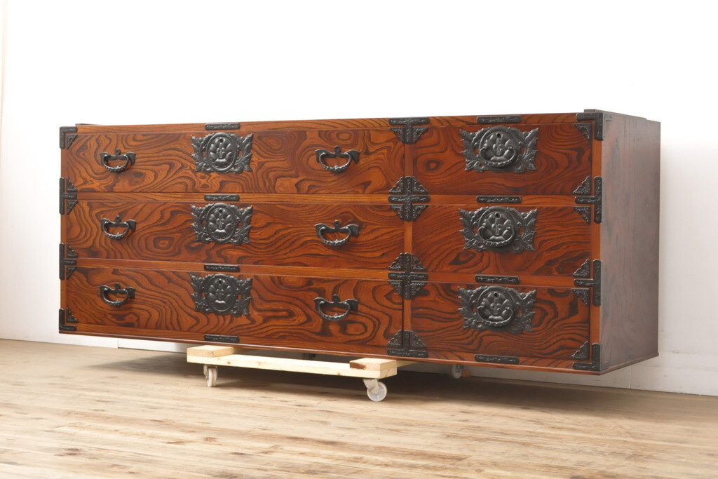 > R-055812 中古 岩谷堂箪笥 力強い杢目と立派な金具が魅力的なローチェスト(サイドボード、テレビ台、引き出し)(R-055812)