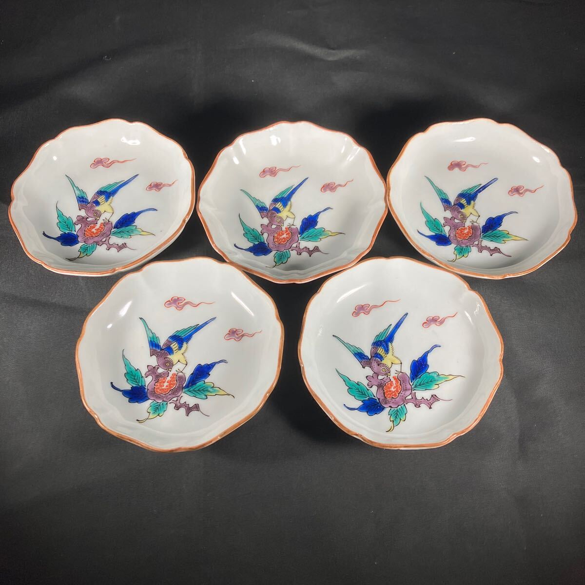- 九谷焼 色絵 花鳥図 五客組 鷹 躍動感 小皿 骨董 角福
