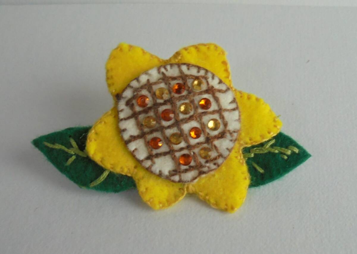 - ♪ ハンドメイド ひまわり 向日葵 ブローチ フエルトに刺繍 高分子結晶ストーン使用 綿入り