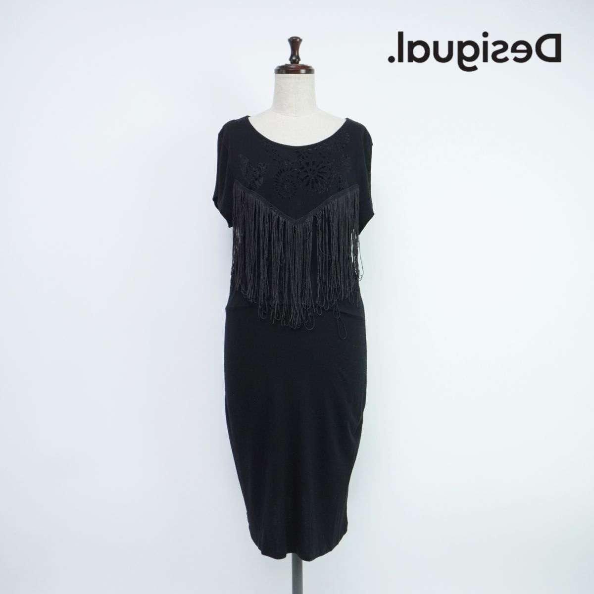 > 美品 Desigual デシグアル Say Something Nice フリンジ 半袖膝丈ワンピース レディース 黒 ブラック サイズM*QC174