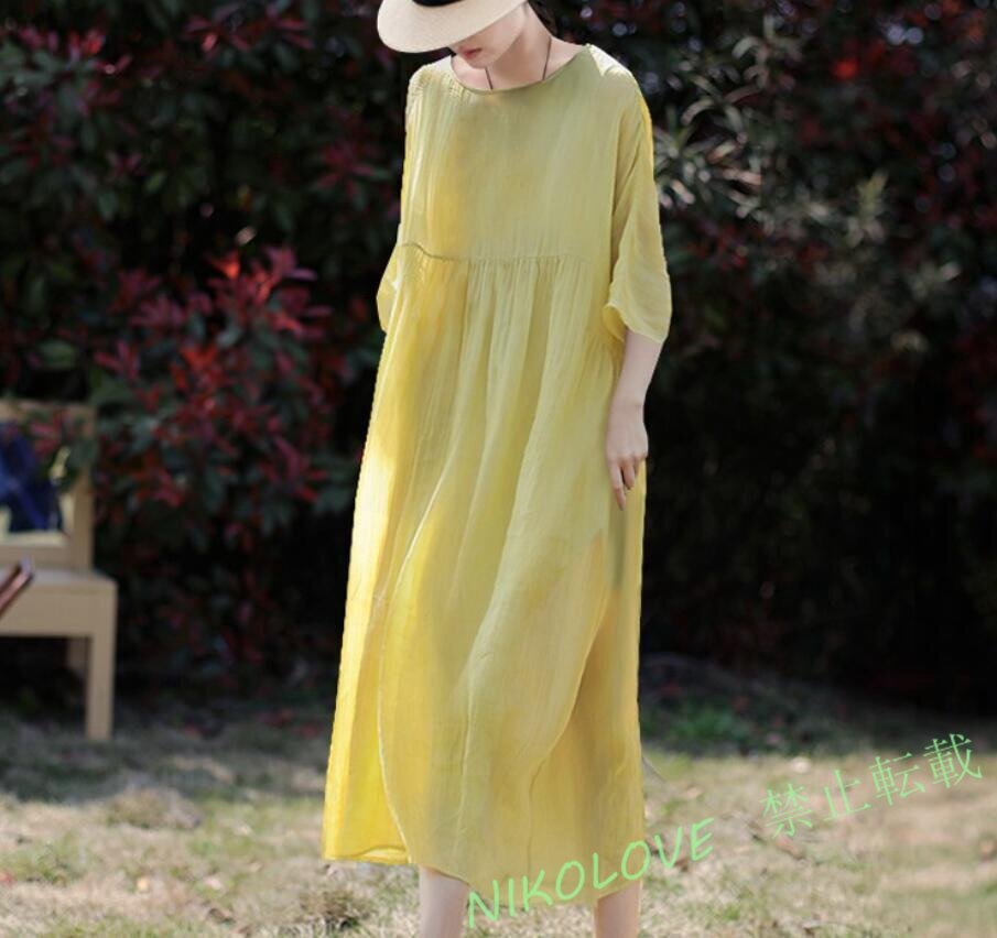 - 新品 夏ゆるシルエット ワンピース レディース 綿麻ワンピース ロングワンピース 半袖 体型カバー ロング丈 無地 カジュアルイエローLG884