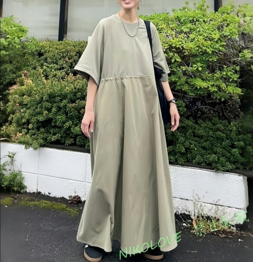 - 新品 夏オシャレ きれいめ Aラインワンピース ロングワンピース ゆったり 大きいサイズ 体型カバー 半袖 マキシワンピースグリーン LG777
