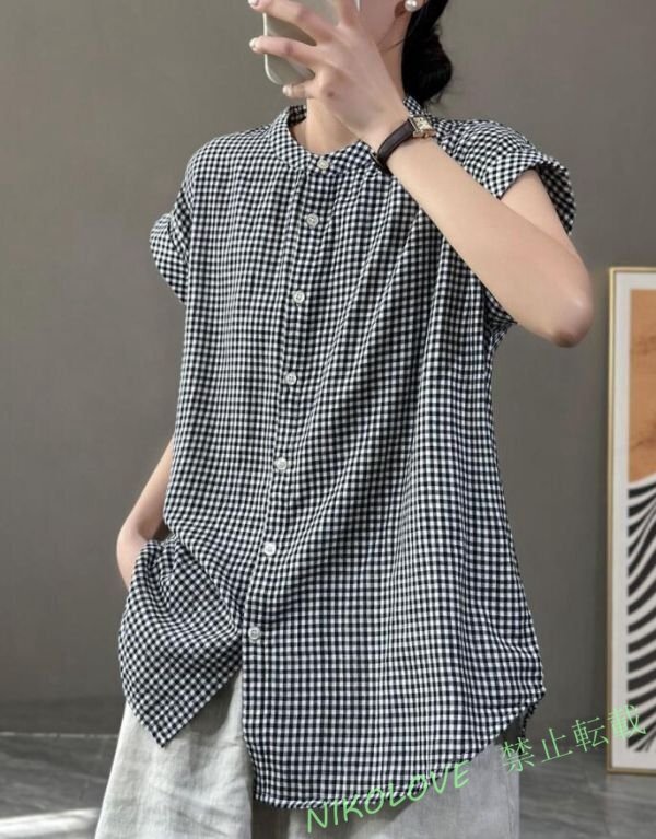 > 新品 チュニック シャツ ブラウス レディース トップス ゆったり 前開き 大きいサイズ 綿麻 半袖 涼しい グレーチェック柄 2XL LG901