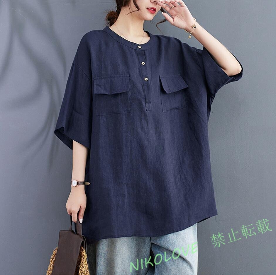 - 新品チュニック ロングシャツ レディース 夏 綿麻 半袖 大きいサイズ ゆるシルエット 無地 黒 LH784