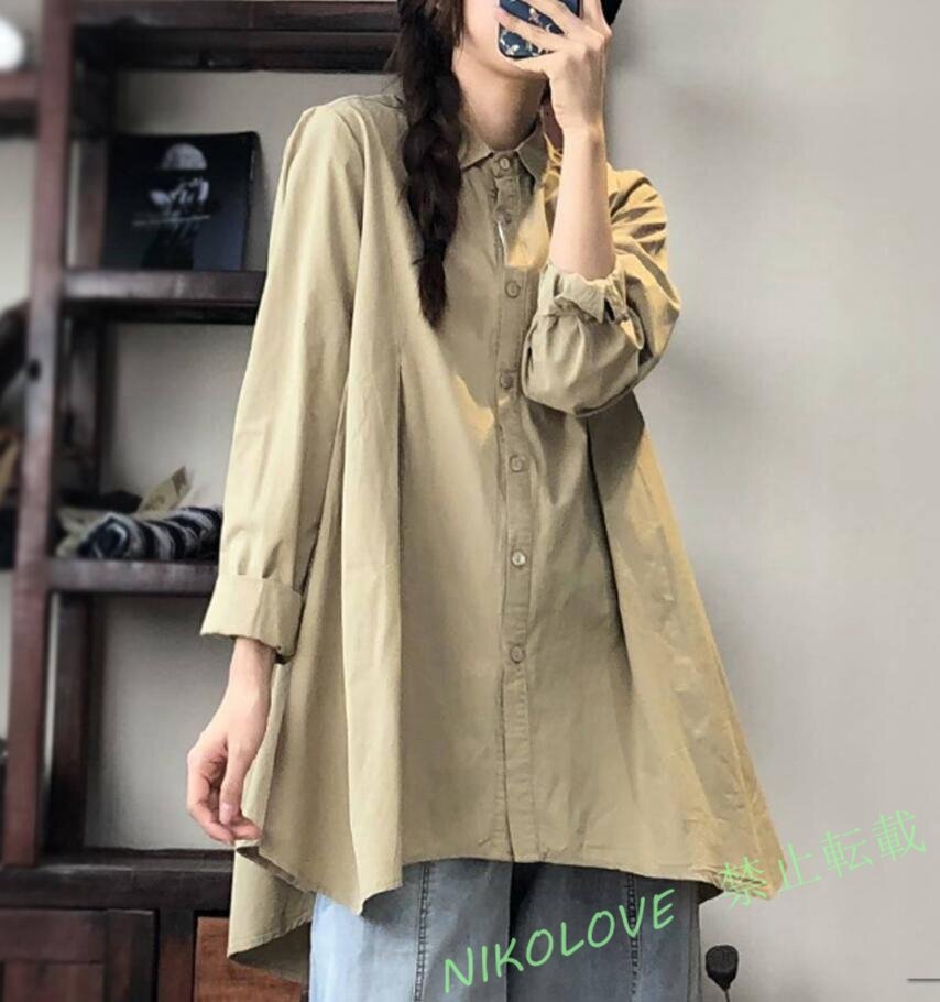 - 新品ロングシャツ レディース ブラウス チュニック コットン ロングブラウス 長袖 シャツ ナチュラル 着痩せ ゆったり 大人 カーキ LJ089