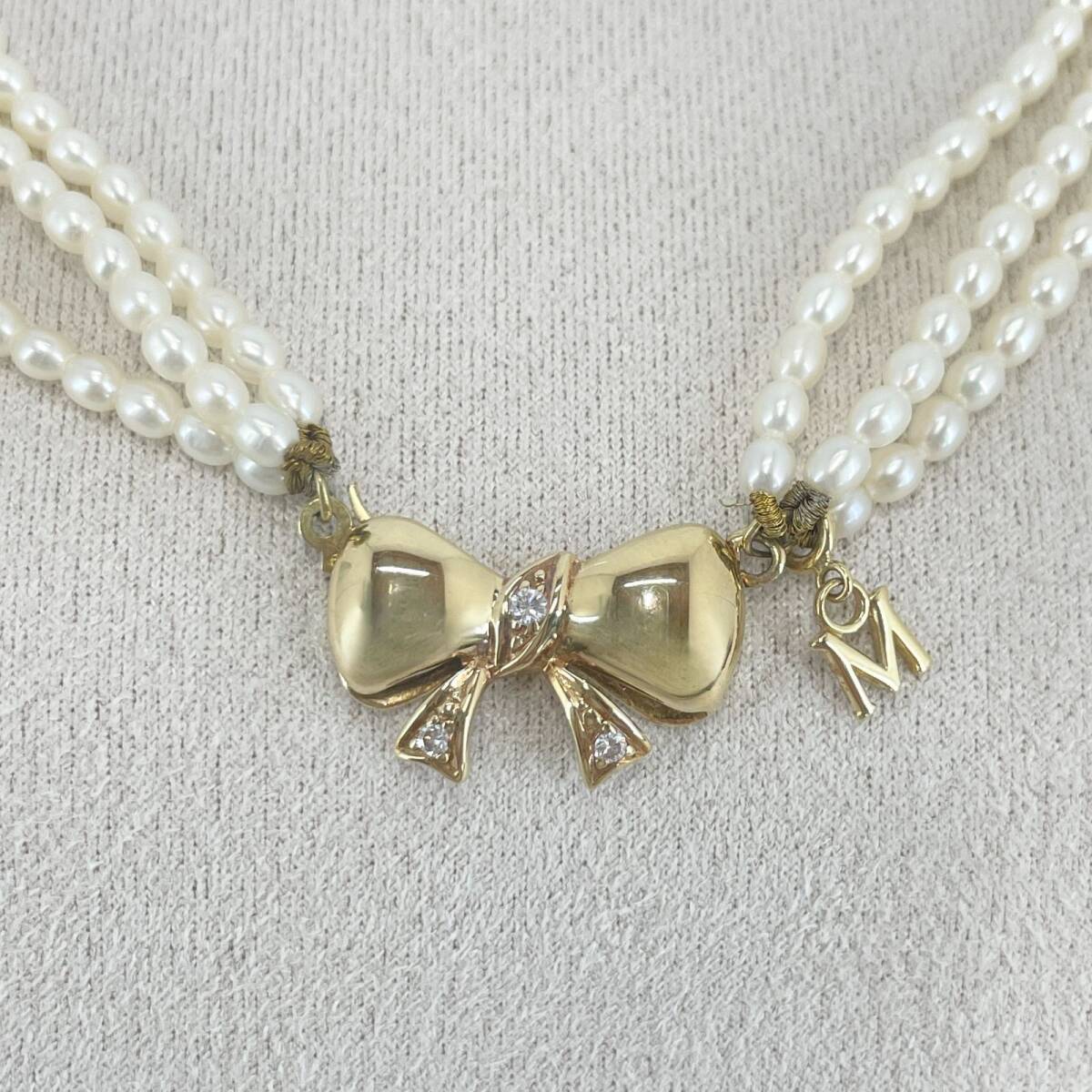 - ミキモト ライスパール リボン ネックレス K18 淡水 ベビーパール×ダイヤ 3連 リボンモチーフ /24-710