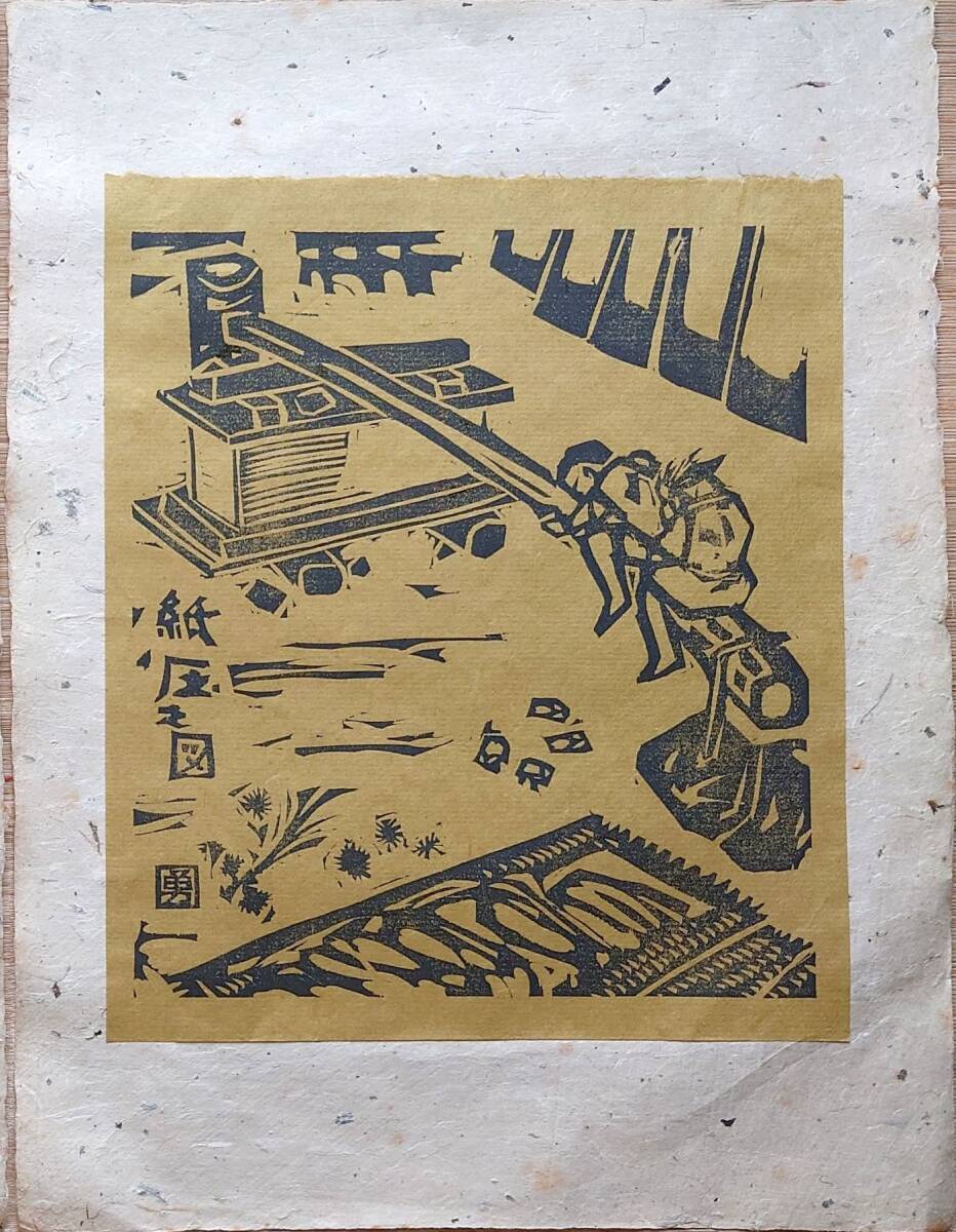 - f24060622〇和紙木版 紙漉 紙圧之図 勅題 紙にちなみ 愛沢 勇 京都 長谷川 昭和39年〇和本古書古文書