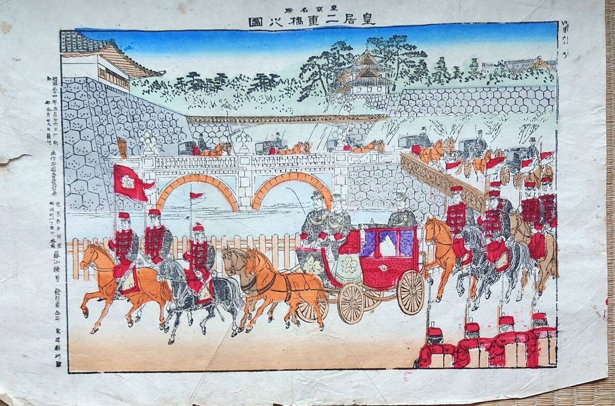 - f24070540〇一枚刷物 彩色石版画 皇居二重橋の図 明治34年〇和本古書古文書