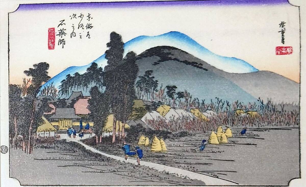 - f24070145〇彩色木版画 ハガキサイズ 東海道五十三次 石薬師宿 保永堂版 広重 複刻昭和年代〇和本古書古文書