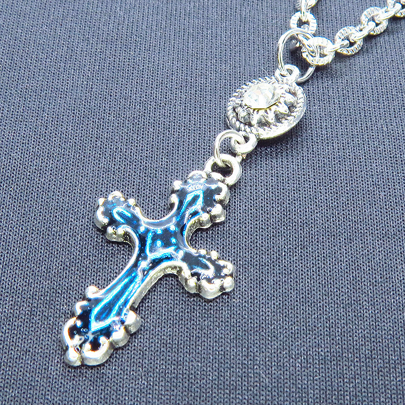 - アンティークシルバー ブルーレジンのゴシック調ロザリオとラインストーンを組合せたペンダントネックレス