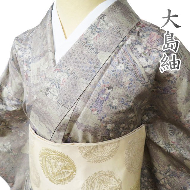 > 大島紬 着物 中古 正絹 袷 カジュアル 人物模様 花模様 やや薄い灰汁色 多色 身丈158cm 裄64cm M きもの北條 A1055-5