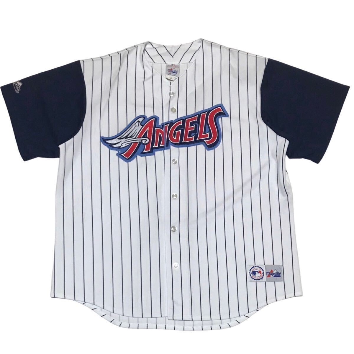 > 【90s】Majestic マジェスティック MLB アナハイム エンジェルス ベースボールシャツ メンズXXL ストライプ 白 紺 旧モデル 廃盤 希少レア