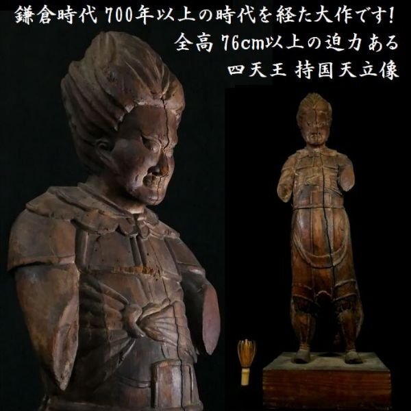 > 【 恵 #1230 】鎌倉時代 700年以上の時代を経た古き良き大作です! 全高 76cm以上 四天王 持国天立像 木彫 検:仏教美術