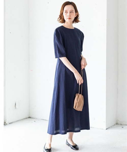 - IENAイエナ サッカーギンガムデザインワンピース◆ロング丈フレアギャザーチェック半袖 アローズplageスピックドゥーズィエム ネイビー系