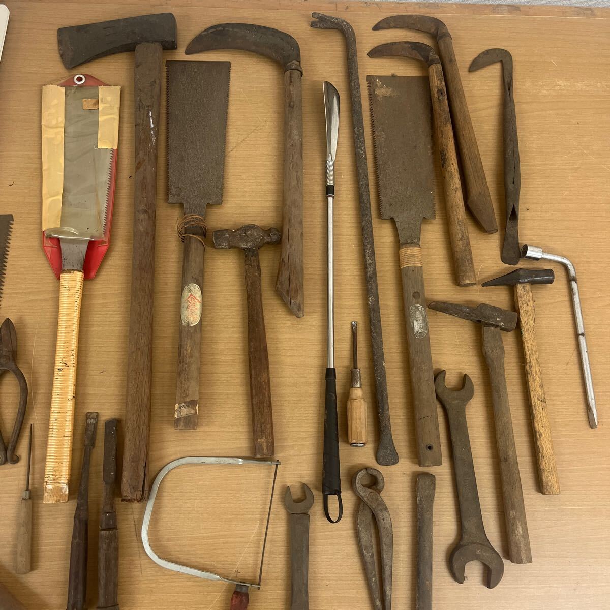 - R-251☆120サイズ 大工道具 まとめ 大工 斧 ノコギリ 鎌 バール? ハンマー 金槌