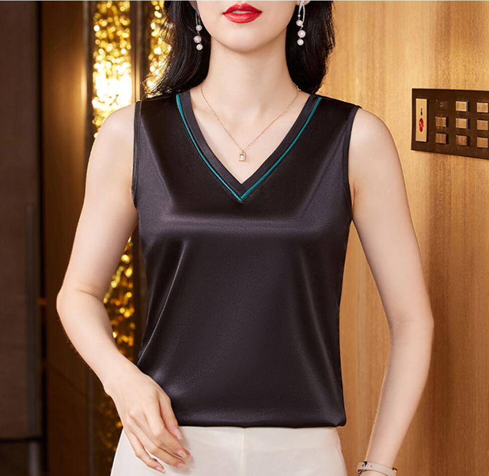 - 新品 人気推薦 /トップス ノースリーブ シャツブラウス 薄手 上品 光沢感 Vネック 着痩せ サテンブラウス オフィス通勤 大人 /ブラック