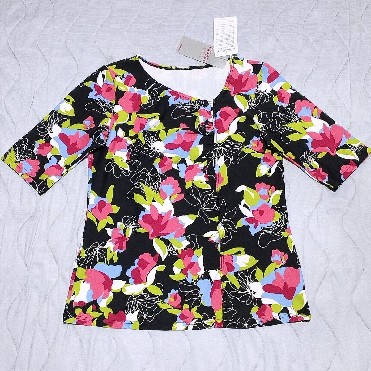 - NAWA 名和 ナワ Tシャツ カットソー 花柄 黒 L レオタード生地 和柄
