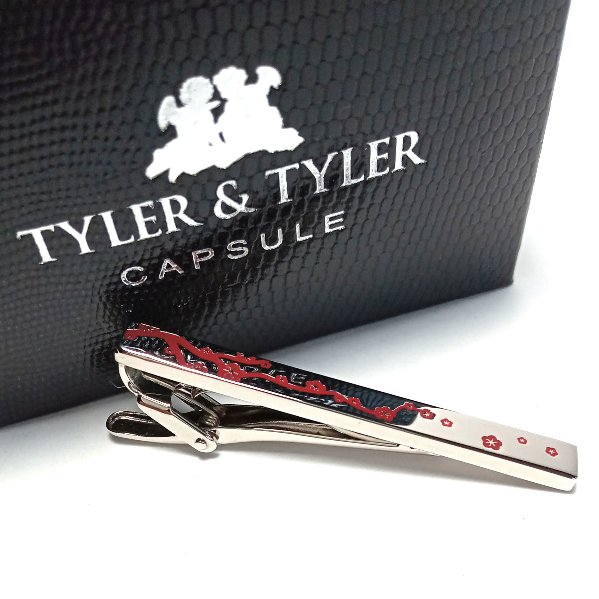 > 【ttt261】TYLER & TYLER タイラー&タイラー タイバー ネクタイピン シルバー×レッド 赤 ブロッサム 桜の枝と花 和柄 ENGLAND 英国製