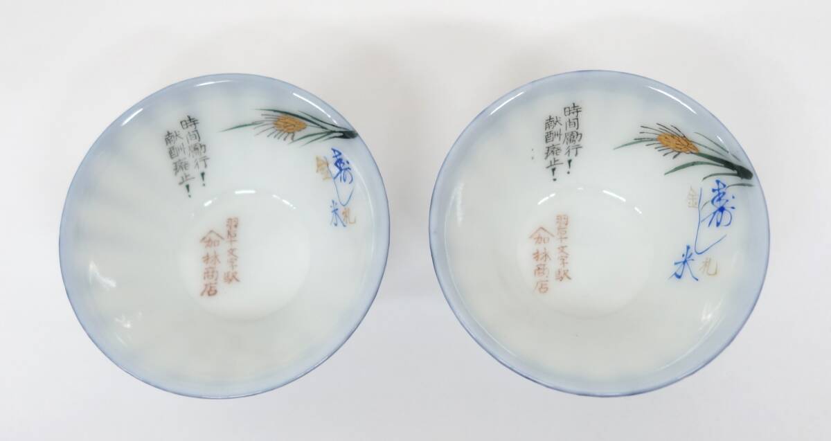 - 骨董 時代物 *猪口 お猪口 酒器 2客 セット *山加 林商店 羽石十文字駅 寿し米 金礼 時間勵行 献酬廃止 陶芸 アンティーク