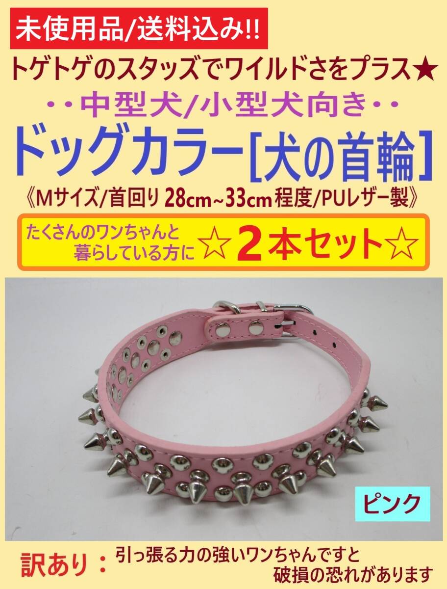 > 訳あり 未使用 犬 首輪 ピンク Mサイズ 2本セット A スタッズ スパイク 首回り28-33cm 調節可 中型 小型 カラー PUレザー トゲトゲ 海外製
