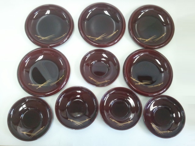 - ☆r☆【美術 工芸・インテリア】茶道具 銘々皿 松葉紋 漆器 菓子皿/松葉紋 漆器 茶托 各5客/煎茶道具 美術木工