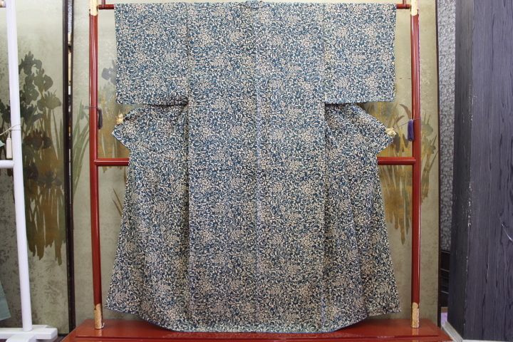 > きもの今昔7485 小紋のきもの 広衿袷手縫仕立 正絹一越生地 鉄紺色地唐花の小紋柄 身丈150cm