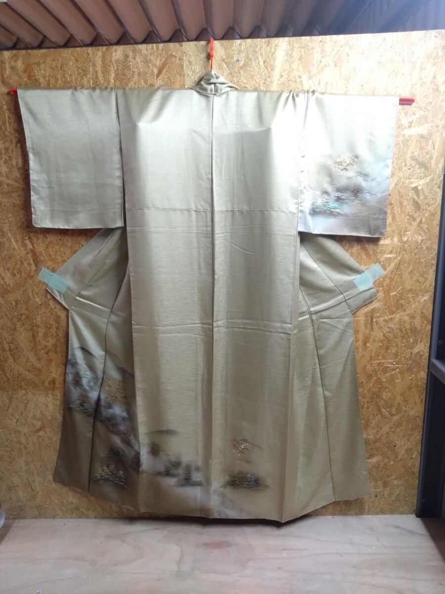 - ● 10 仕付け糸付 未使用品 金糸 刺繍 塔 キラキラ グリーン 金 銀 彩 正絹 着物 入学 卒業 結婚 式 お宮参 七五三 訪問着 現状品 ③