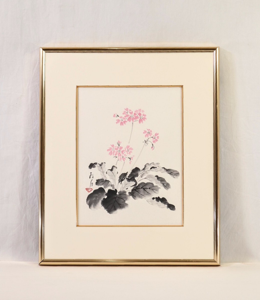 - 真作 大月紅石 墨彩「ゼラニウム」画寸 25×34cm 広島県出身 水墨画紅石会主宰 大倉雨石に師事 葉の濃淡の変化が美しく薄桃色の咲く花 9624
