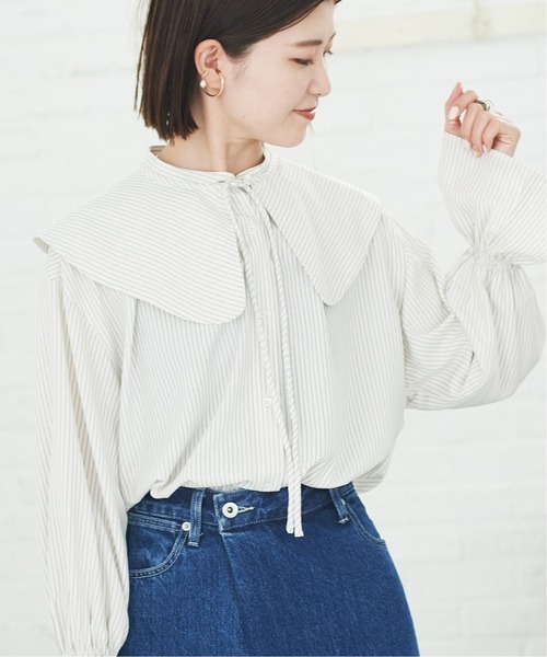 > 美品spick&span ドットストライプアタッチドカラーブラウス◆ノーカラーボリュームスリーブシャツ IENAplageアローズトゥモロー ホワイト