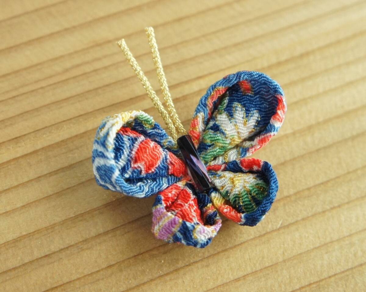 - ♪ ハンドメイド ブローチ 蝶々 ちょうちょ つまみ細工 ちりめん金彩 細長ビーズ 使用