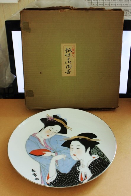 > ★ つ 春章 画 未使用 美人画 浮世絵 丸皿 飾り インテリア 径26cm 高さ2.6cm 重さ575g 箱)縦27cm 幅26.5cm 高さ4.5cm 総重量710g