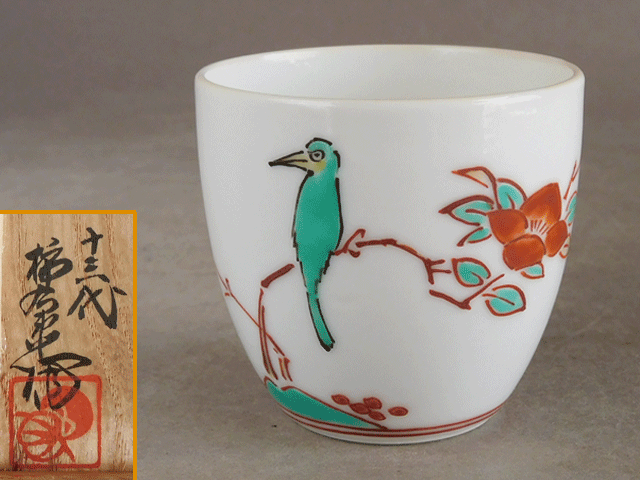 - 十三代 酒井田 柿右衛門 本人作 濁手 花鳥文 ぐい呑 盃 酒呑