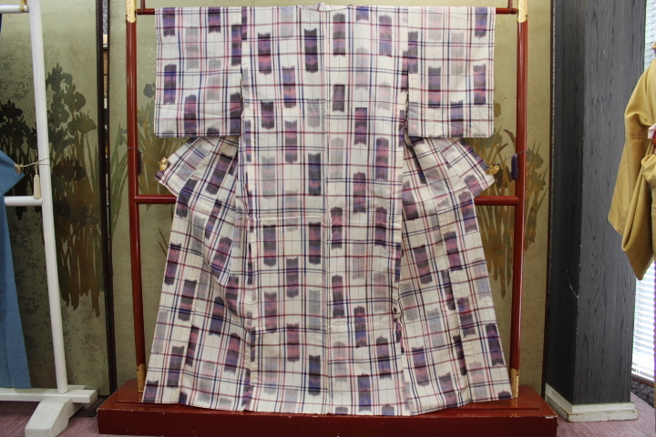 > きもの今昔7584 単衣のきもの 広衿セブセ付き手縫い仕立て 正絹先染め大格子に絣入り 身丈156cm