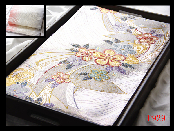 - P929厳選西陣 振袖可 枝垂れ桜紋 シルバー色地 気品豊かに 正絹純金糸両面全通高級美術袋帯 新品同様 ◇検◇簪着物名古屋帯帯締め
