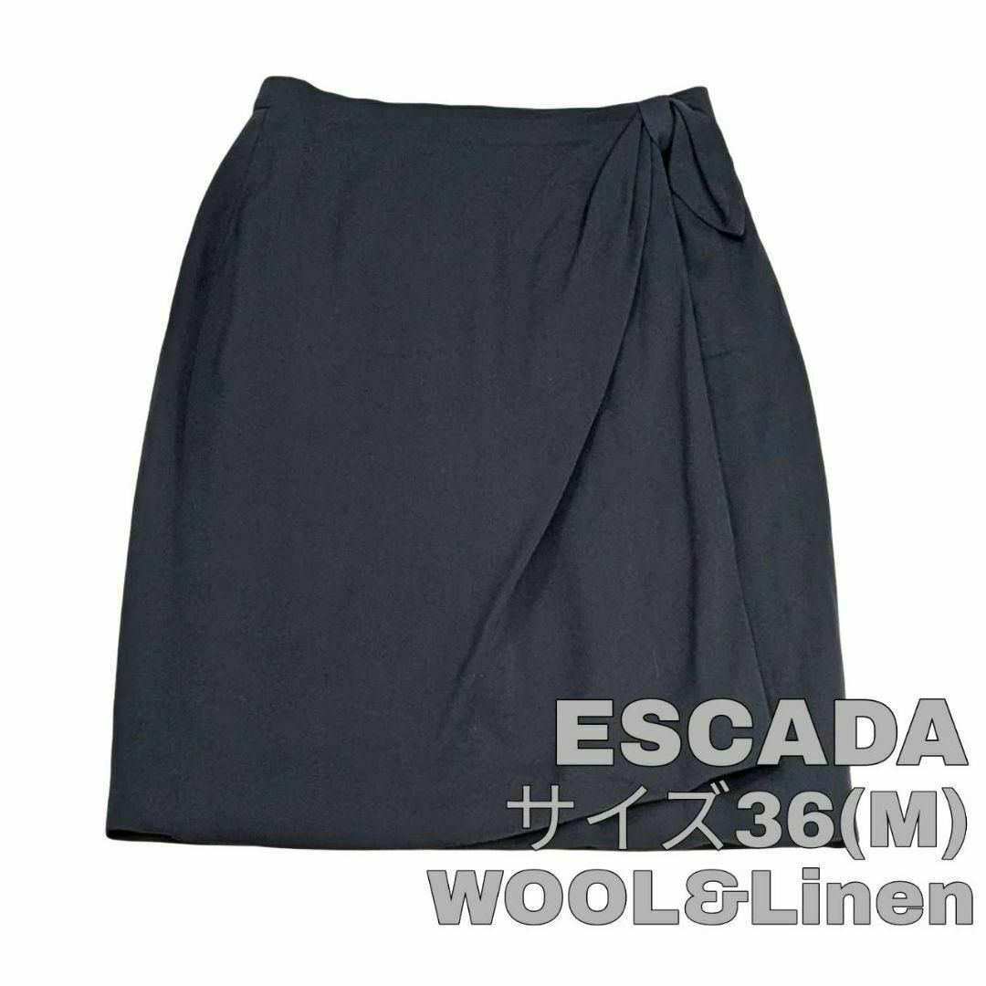 - 【最終値下げ】256 ESCADA エスカーダ ひざ丈タイトスカート ブラック サイズ36 Mサイズ リボン 黒 ウール リネン 古着 レディース