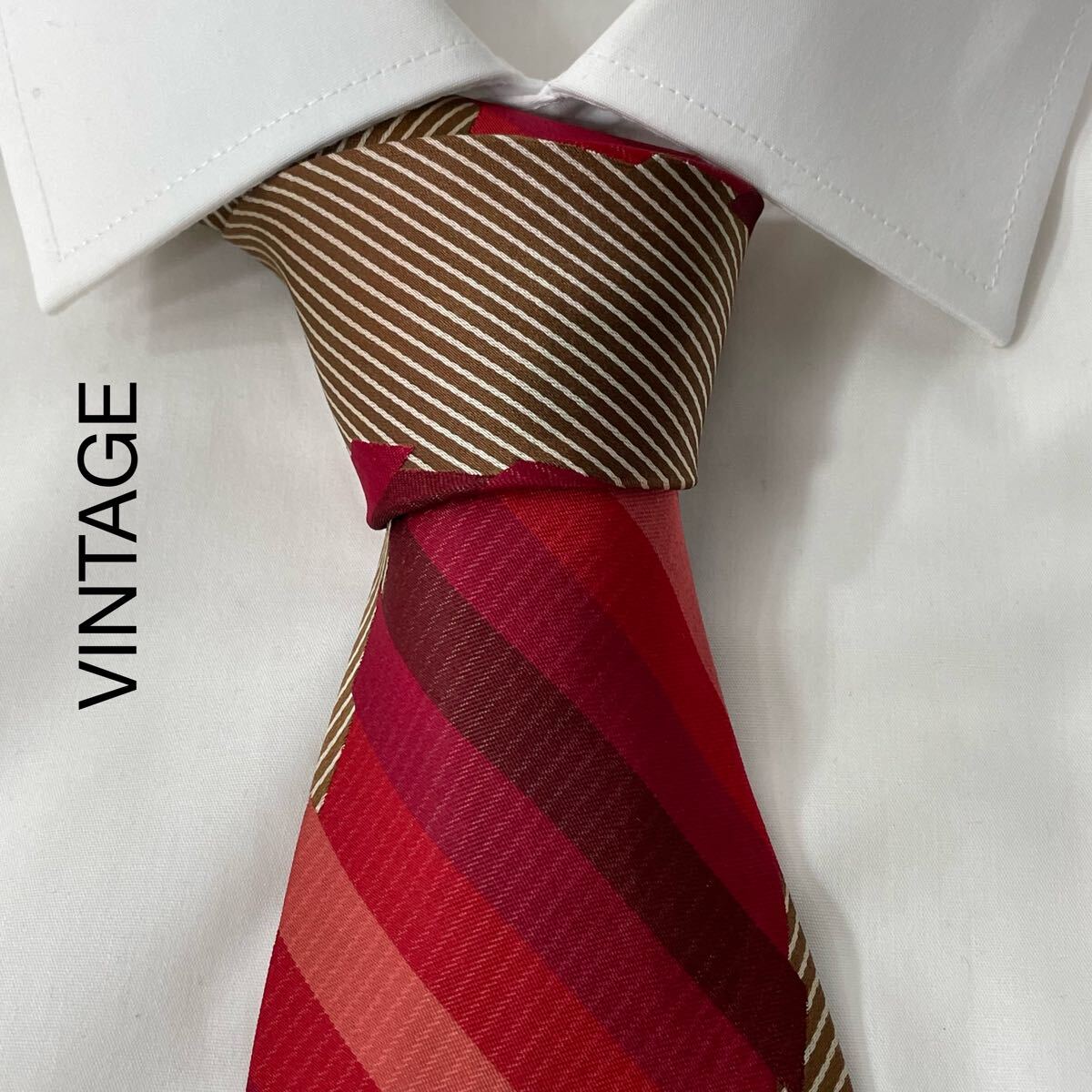- 希少 RAVAT ヴィンテージ 変則 ストライプ デザイン シルク ネクタイ レッド ブラウン TG248