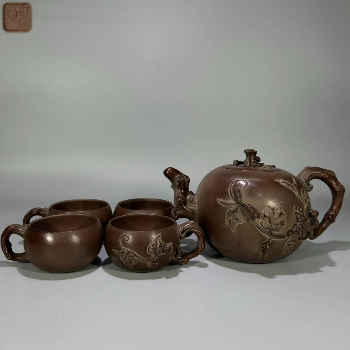 - 古陶芸 紫砂壷 近現代 【朱可心】 製 「リスのブドウ壺」 5点セット 紫泥 煎茶 急須 茶道具 唐物 時代物 茶器 容量750cc LT-2410100
