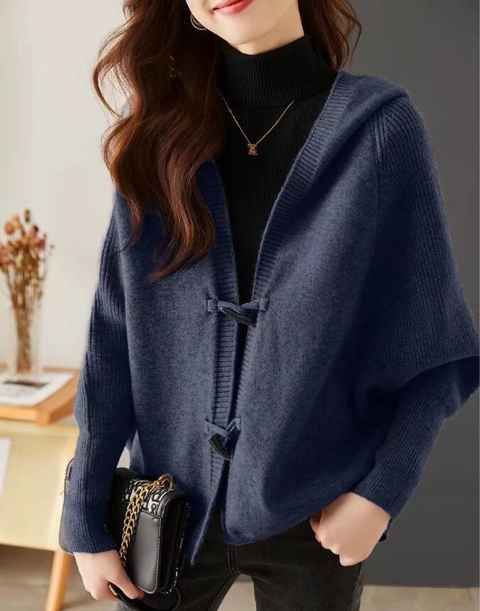 - 秋新品* パーカー レディース ニットカーディガン フード付き 長袖 羽織 カジュアル 体型カバー オフィス 通勤 ニットセーター*ネイビー