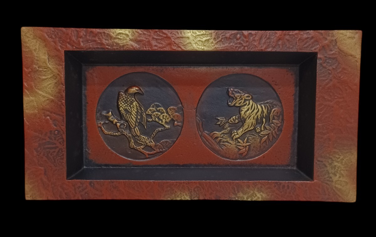 - 岩)銘入り 金属製 トレー 小物入れ オブジェ 置物 インテリア 鋳物 虎 アンティーク アート 金属工芸 241017(N-1-2