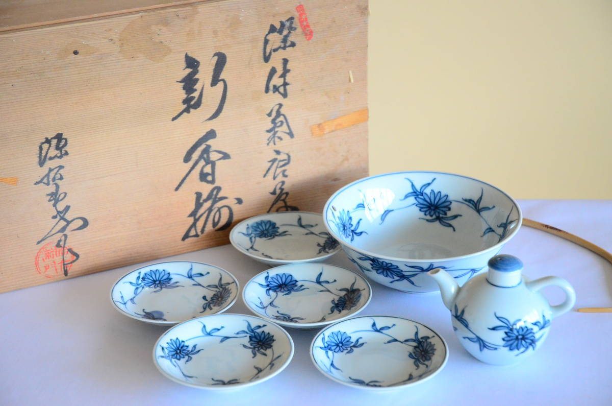館林源右衛門 染付 菊唐草紋様 新香揃 共箱 醤油差 小鉢 小皿 共箱