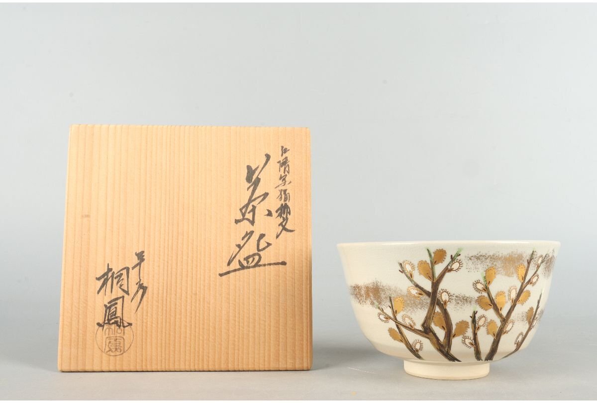 - [ギャラ藤]手塚桐鳳 造/仁清写猫柳文茶碗/共箱/B-1445 (検索)骨董/京焼/清水焼/鉢/茶道具/煎茶道具/煎茶碗/抹茶碗