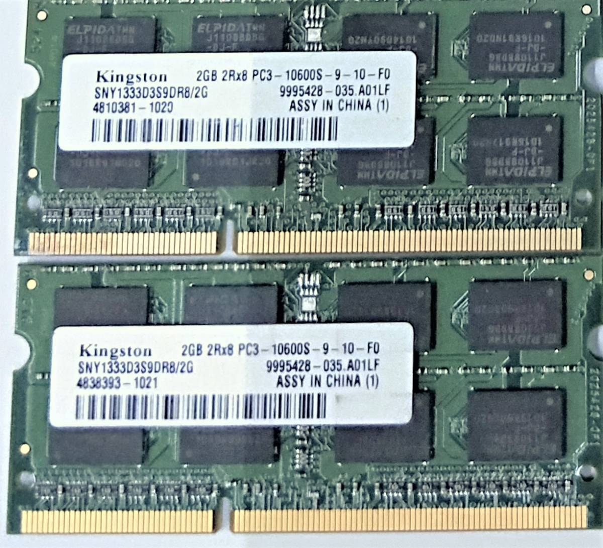 - 【中古パーツ】PC3 ノートパソコン用 KINGSTON 2GB-2RX8 PC3-10600S-9-10-F0 2GBx2枚 計4GB (在庫10枚)送料無料■N(166)