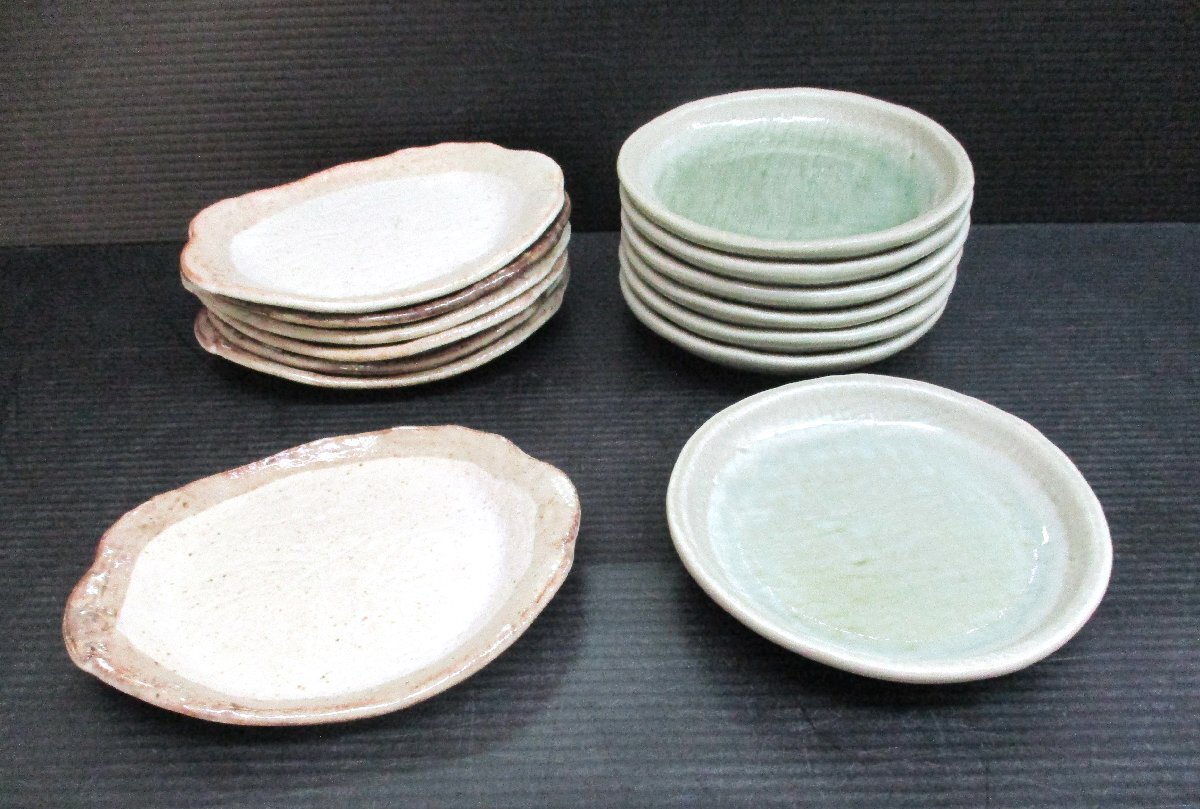 - ★ 98447 和皿 2種 14枚 萩 他 粉引⑦φ16 × 奥行13 × 高さ2㎝ 青磁布目⑦ φ14 x2.2cm 中古 ★