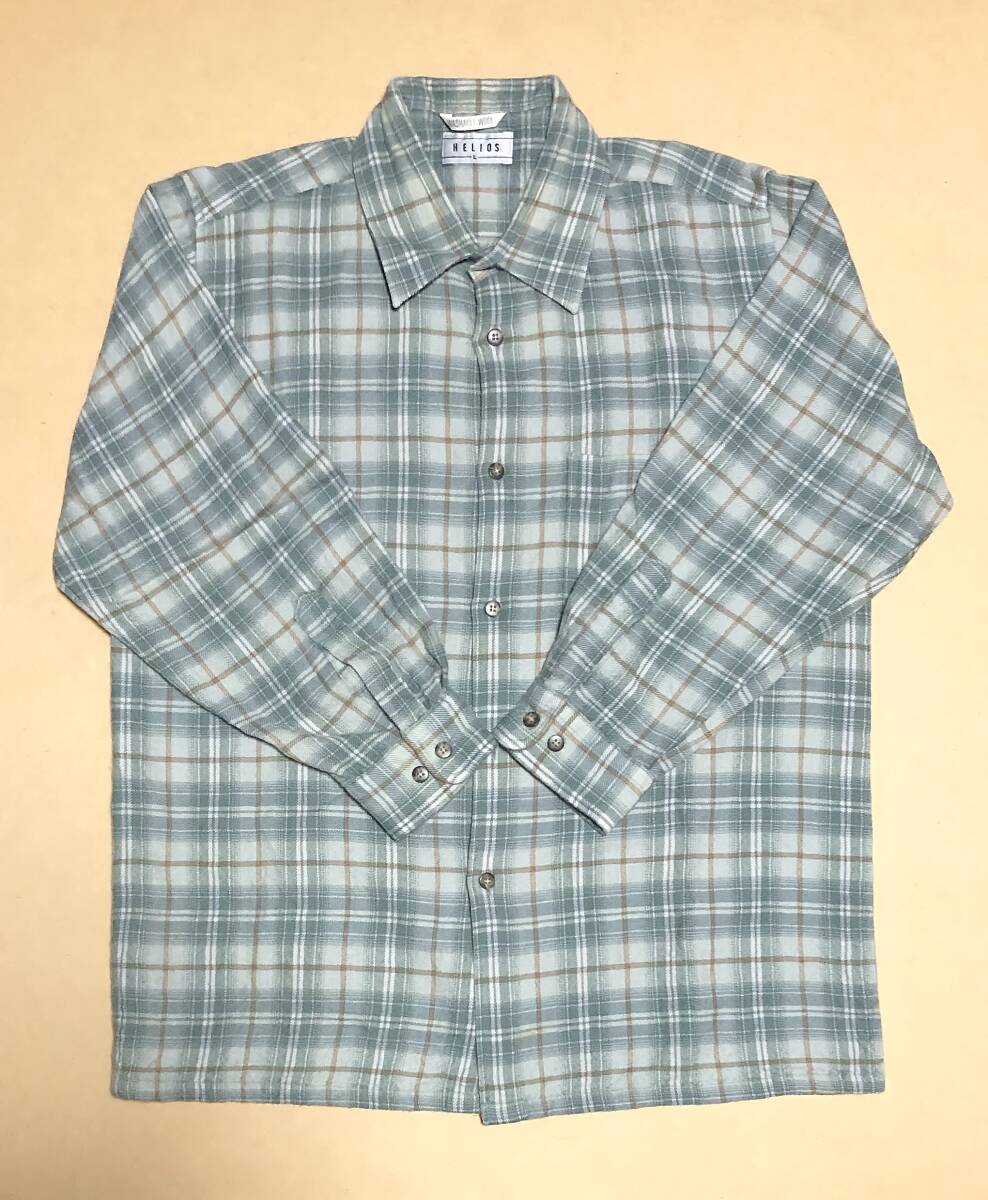 > HELIOS 長袖チェックシャツ Lサイズ グリーン系 毛:100% WASHABLE WOOL NEW WOOL 100% AuBEX オーベクス