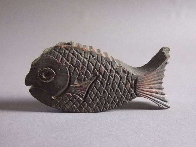 - 江戸-明治期トロトロの木味が素晴らしい鯛焼きのような木彫鯛型小型自在鉤木の古民藝古民具