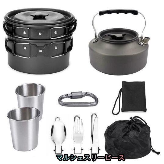- クッカーセット調理器具 軽量 鍋 ケトル キャンピング 10点セット 収納袋付き アウトドア (ブラック)